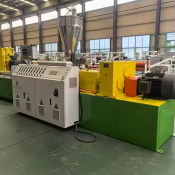 Dette er kernestadiet i hele produktionsprocessen. Det blandede pulver suges ind i tragten på en konisk dobbeltsnekkeekstruder via en vakuumlæsser.