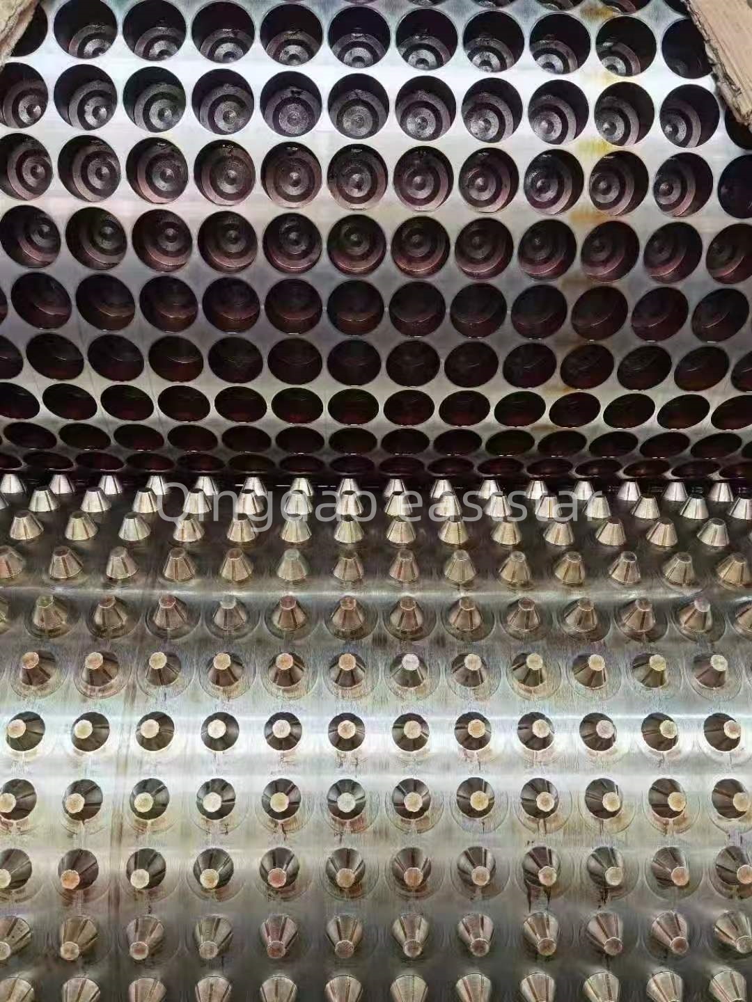 Matricesystemet afPE drænplade produktionslinjeanvender et løbedesign af bøjletypen med en matricebredde på 1650 mm, der er i stand til at producere enkeltlags drænbrædder med en tykkelse på 0,8-1,2 mm. Matriceløberens overflade er forkromet og poleret til en spejlfinish med en hulrumsruhed på Ra0,1um og en ruhed på Ra0,05um. Den to-rullede formningsenhed er udstyret med Φ450×1700 mm ruller, med en rulleoverfladehårdhed på HRC58-62 og en forkromningstykkelse på 0,08 mm. Et specielt multi-runner design sikrer ensartet temperatur. Disse professionelle konfigurationer garanterer, at drænpladeprodukterne produceret afproduktionsliniehave en ensartet prikket struktur og stabil dræningsydelse.