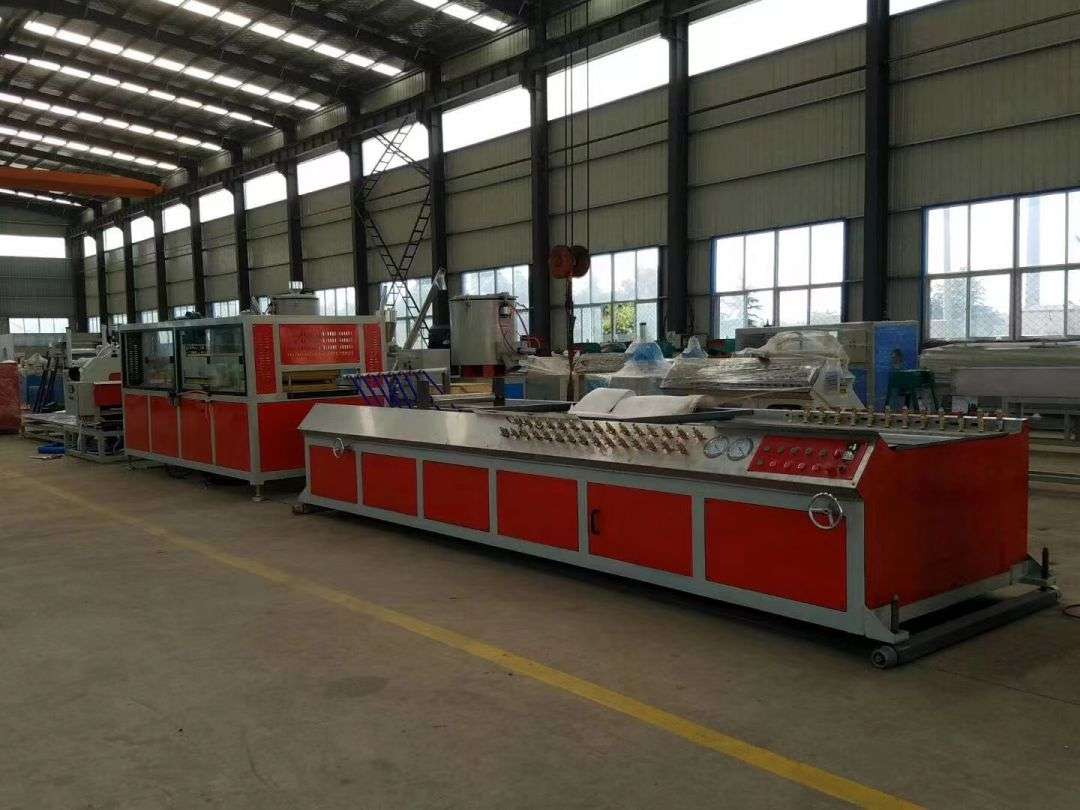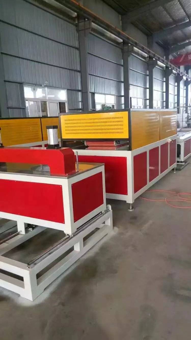 PVC-vægpanelets produktionslinje består hovedsageligt af en konisk dobbeltskrueekstruder, et vakuumformningsbord, en traktor, en skæremaskine og et materialemodtagerstativ.