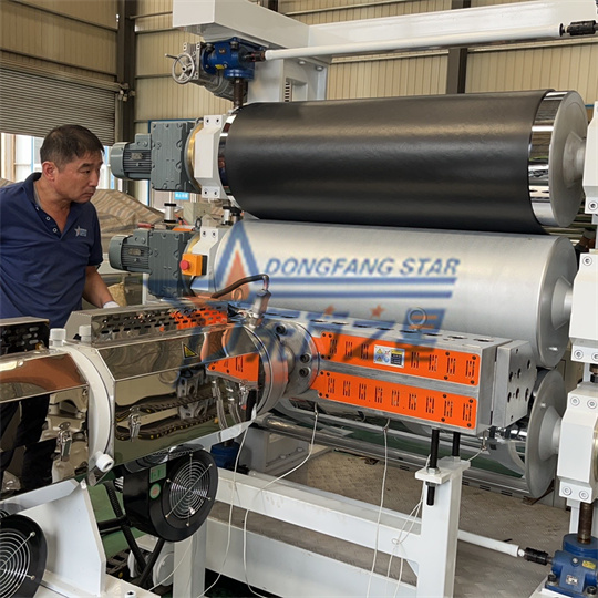 Blødt pvc antistatisk ekstruderudstyr: Udstyret består hovedsageligt af en 120 enkeltskrueekstruder, en tre-rullet kalender, et kølebeslag, en gummirulletrækmaskine, en klippemaskine og en
