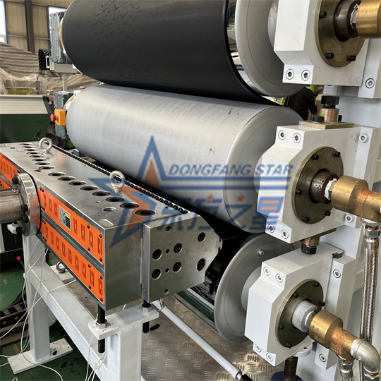 Blød pvc-plade enkeltskrue-ekstruderfremstillingsmaskine: Udstyret består hovedsageligt af en 120 enkeltskrue-ekstruder, en tre-rullet kalender, et kølebeslag, en gummirulle-traktionsmaskine, en skæremaskine og en