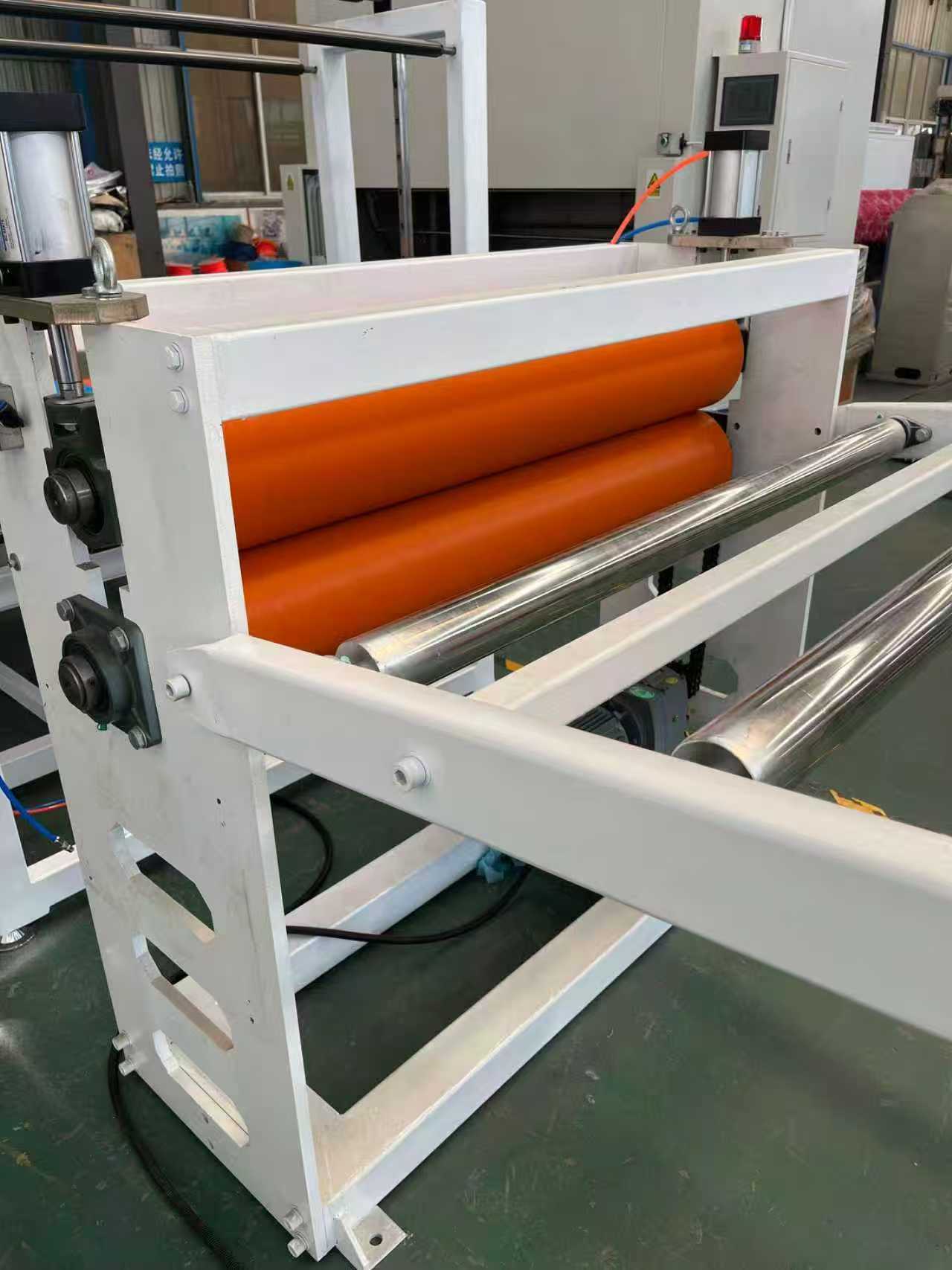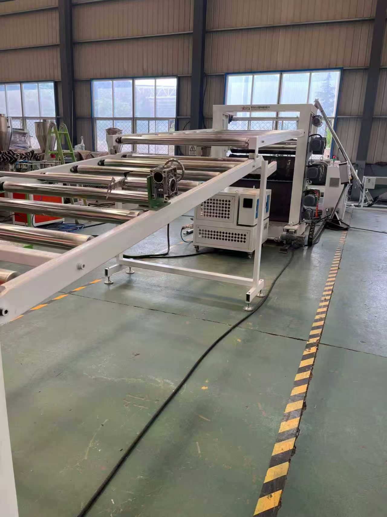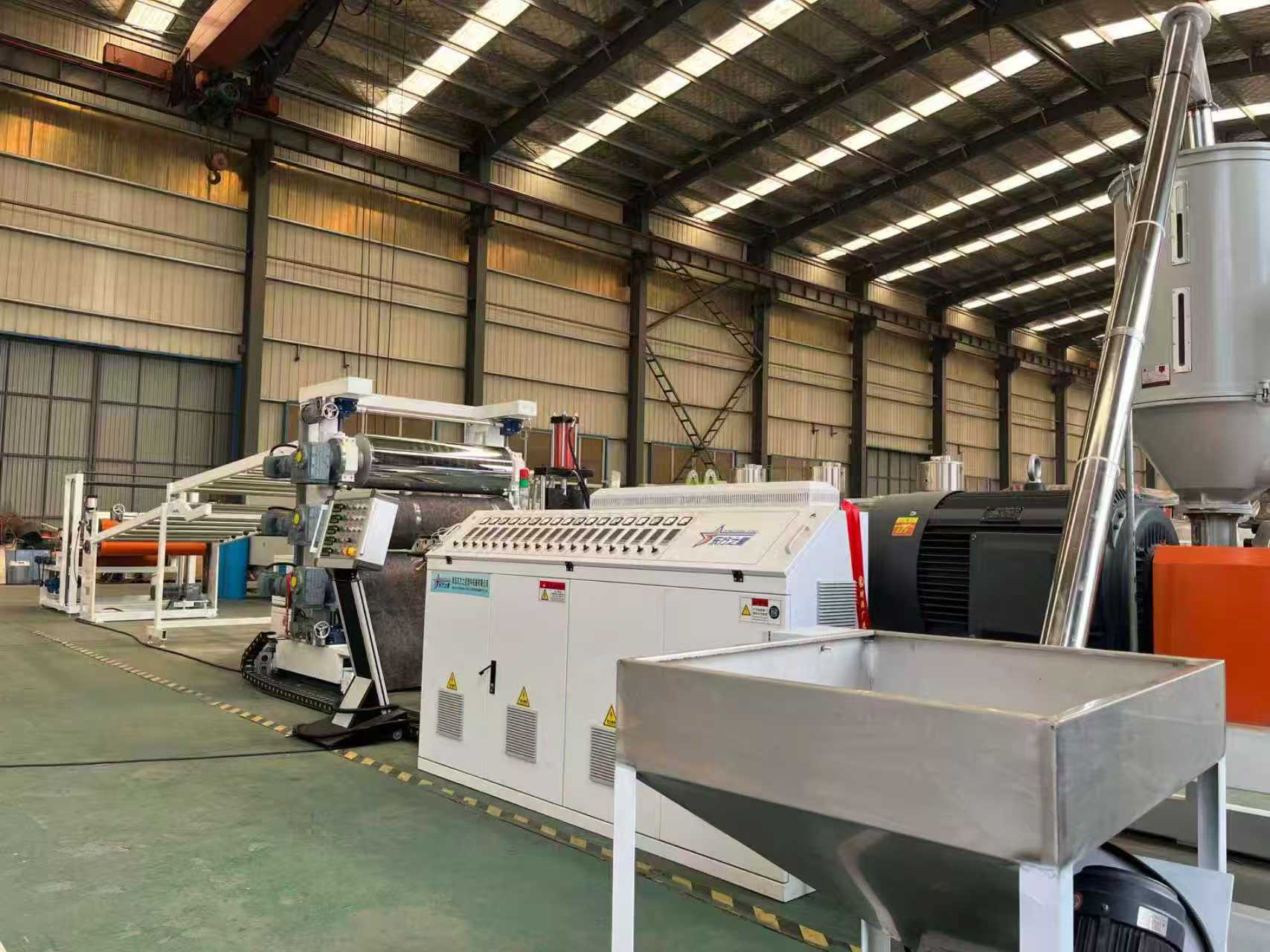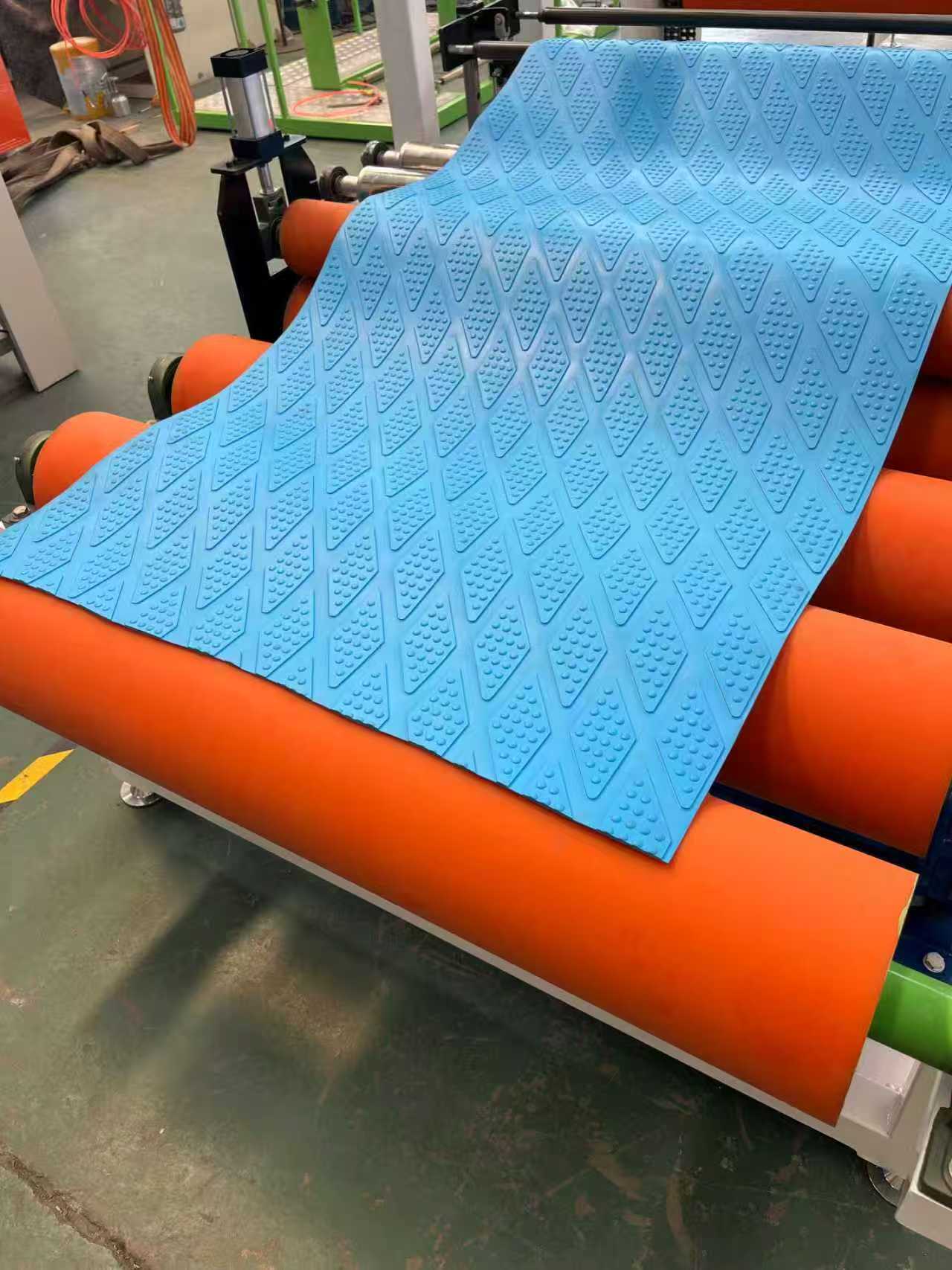 TPE-1000mm skridsikker måtteudstyr til bilgulvmåtter: Udstyret består hovedsageligt af en enkeltskruet ekstruder, en tre-rullet kalender, en 6-meter kølebeslag, en gummirulletrækmaskine, en klippemaskine og en transportbåndsanordning.